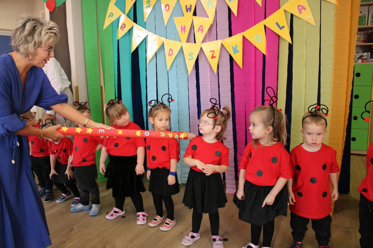Dzielnie przygotowywały się do tak ważnej uroczystości. Zaśpiewały piosenki, powiedziały wierszyk i pięknie zaprezentowały się na naszej promykowej scenie. Pani Dyrektor, wielkim ołówkiem, pasowała każdą Biedroneczkę, nadając jej tytuł: PRZEDSZKOLAKA 😊