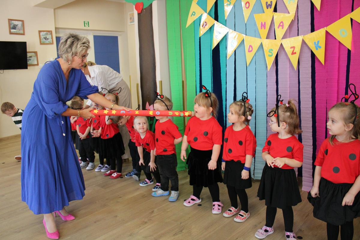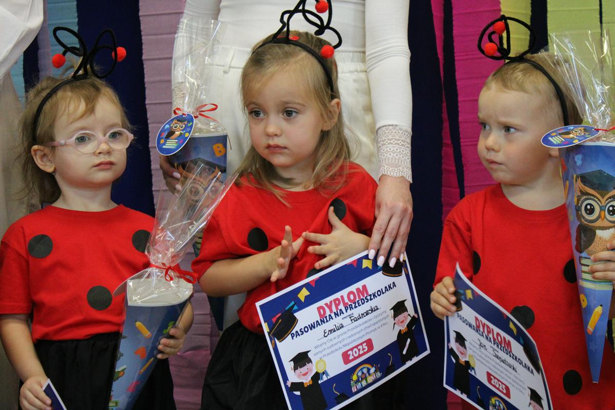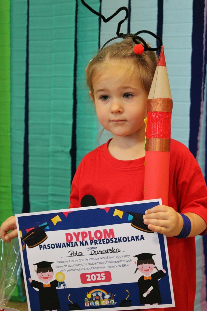Dzielnie przygotowywały się do tak ważnej uroczystości. Zaśpiewały piosenki, powiedziały wierszyk i pięknie zaprezentowały się na naszej promykowej scenie. Pani Dyrektor, wielkim ołówkiem, pasowała każdą Biedroneczkę, nadając jej tytuł: PRZEDSZKOLAKA 😊